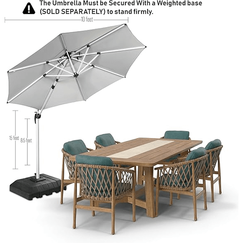 Transform your outdoor space with the ZUPERIA 10x10 ft Cantilever Patio Umbrella, designed with 360-degree rotation, solar-powered LED lights, and a double-vented UV- and fade-resistant canopy. The durable aluminum frame, easy crank lift system, and adjustable tilt make it a perfect addition for day and night use in gardens, patios, and decks. (Standing rack included; base not included.)